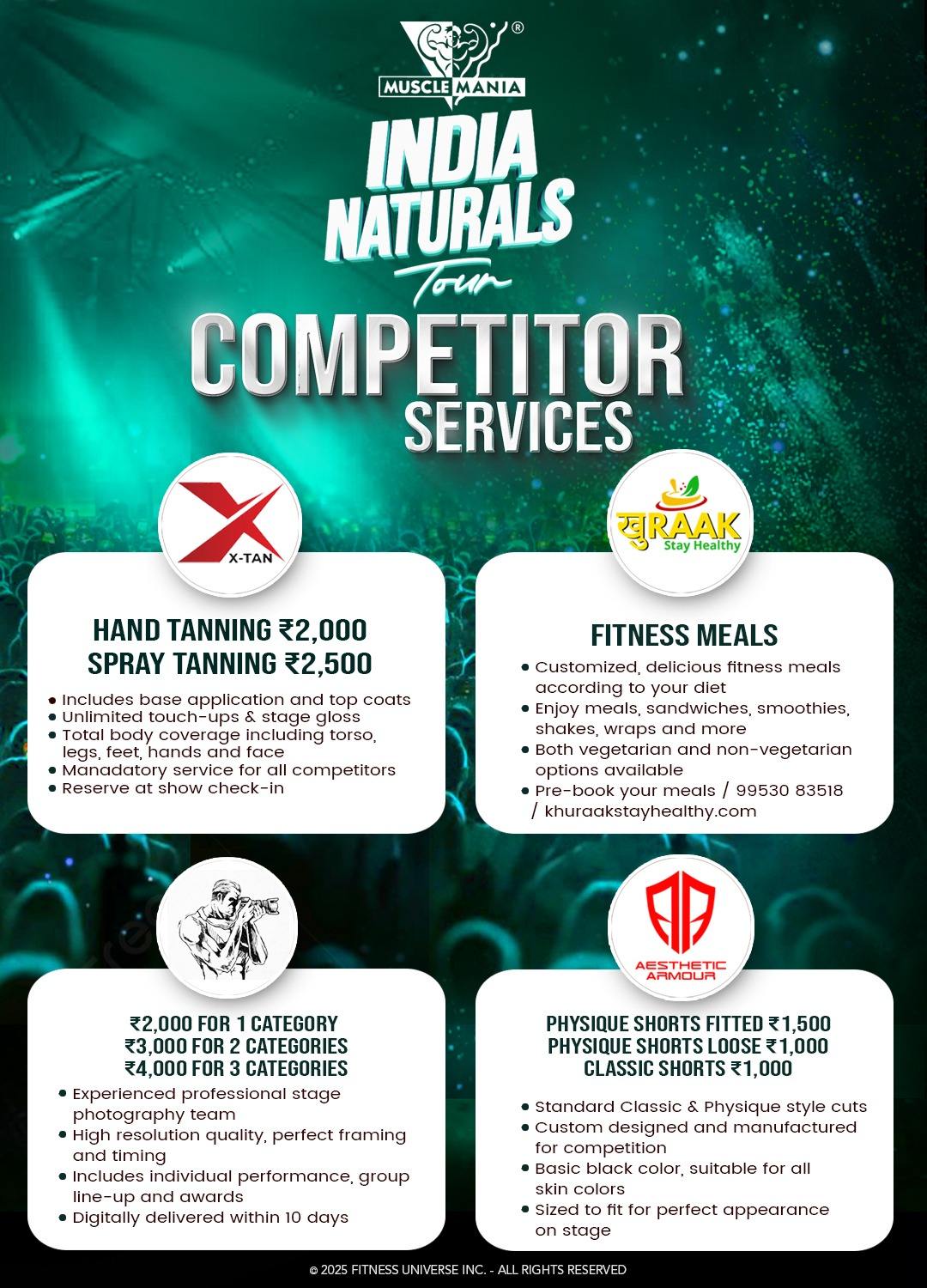 All Regional shows competitors will receive a Musclemania® India Shirt or Tank, Poster, Wrist Band and other gifts. And all National Championship competitors will receive other specially designed Musclemania® apparel and other exclusive gifts. Custom medal awards and Certificate of Participation will be presented to all competitors at all shows while prized Musclemania® trophies will be presented to all Division Champions.